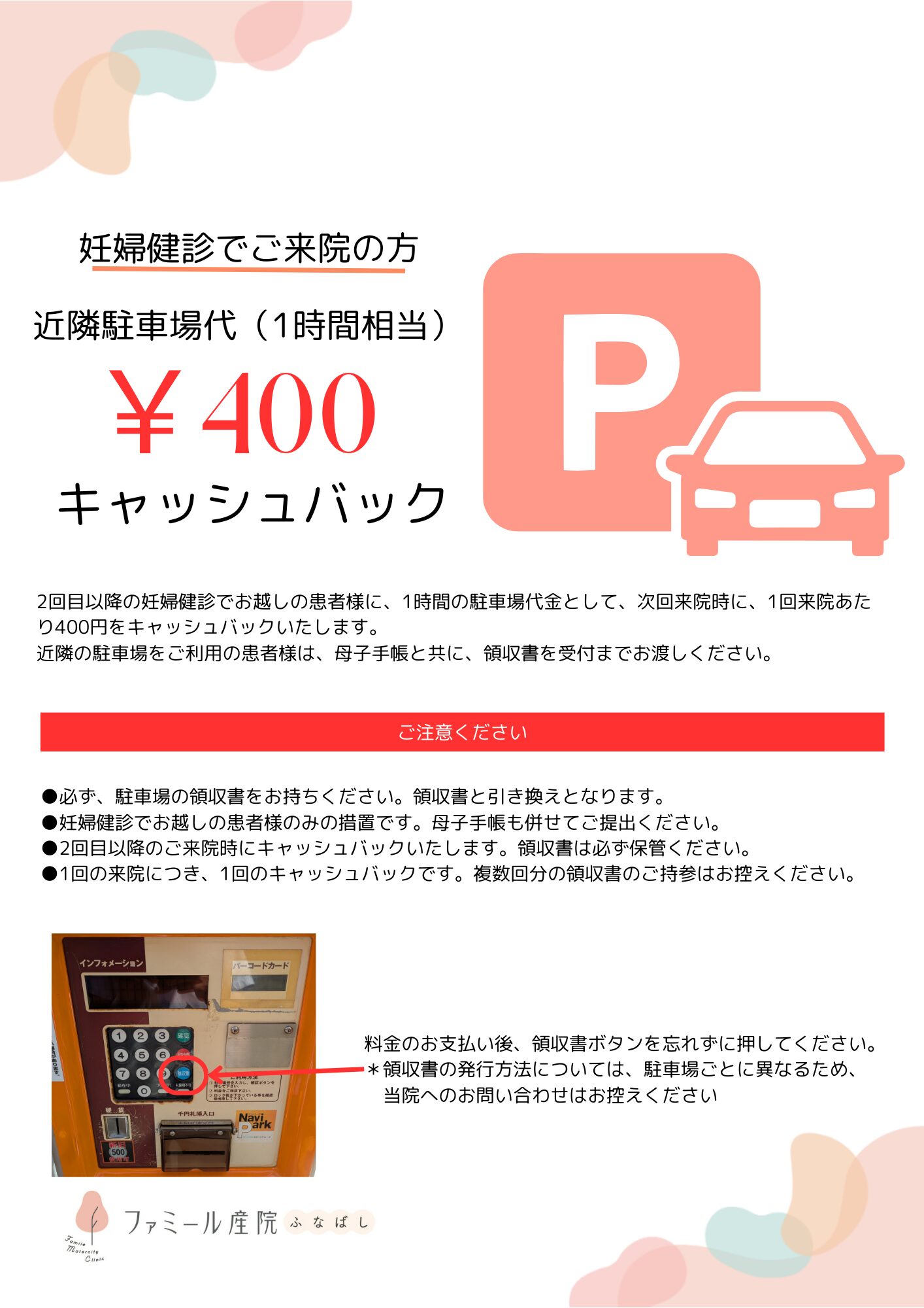 ファミール産院ふなばしでは、2回目以降の妊婦健診でお越しの患者様に、1時間の駐車料金として、次回来院時に1回来院あたり400円をキャッシュバックしております。